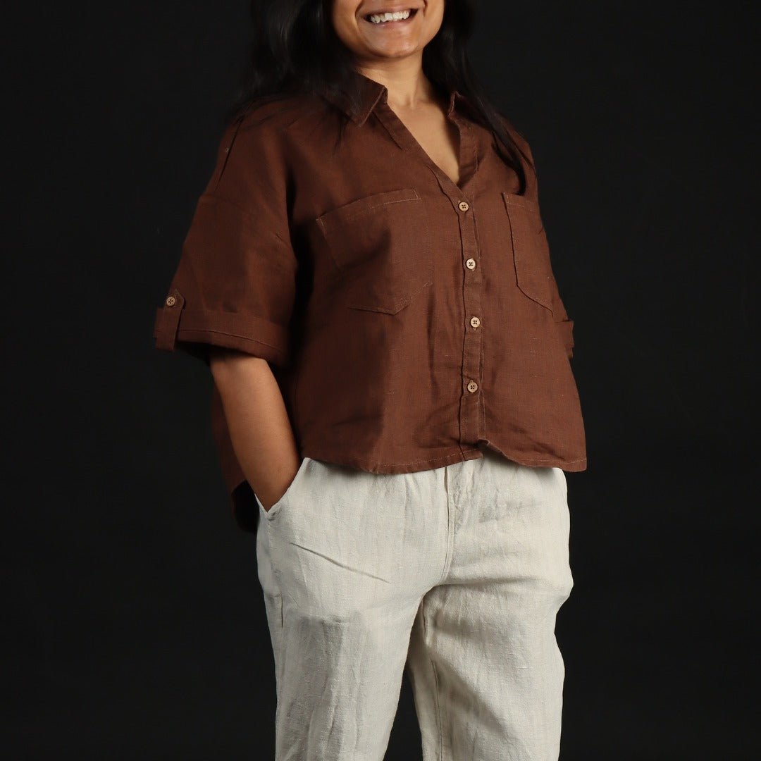 Oversize Boxy Crop Shirt - Women- 100% Premium Linen - Brown