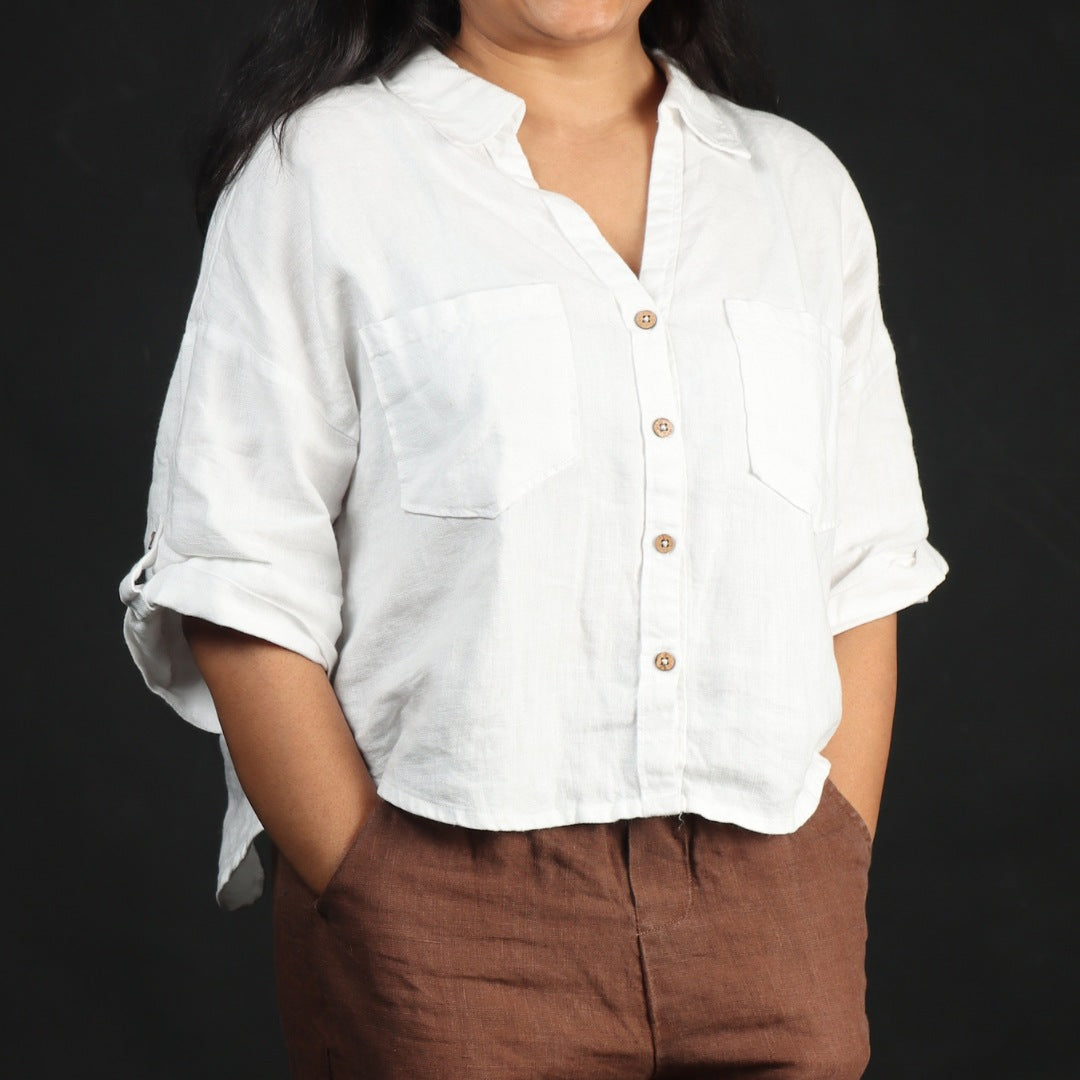 Oversize Boxy Crop Shirt - Women- 100% Premium Linen - White