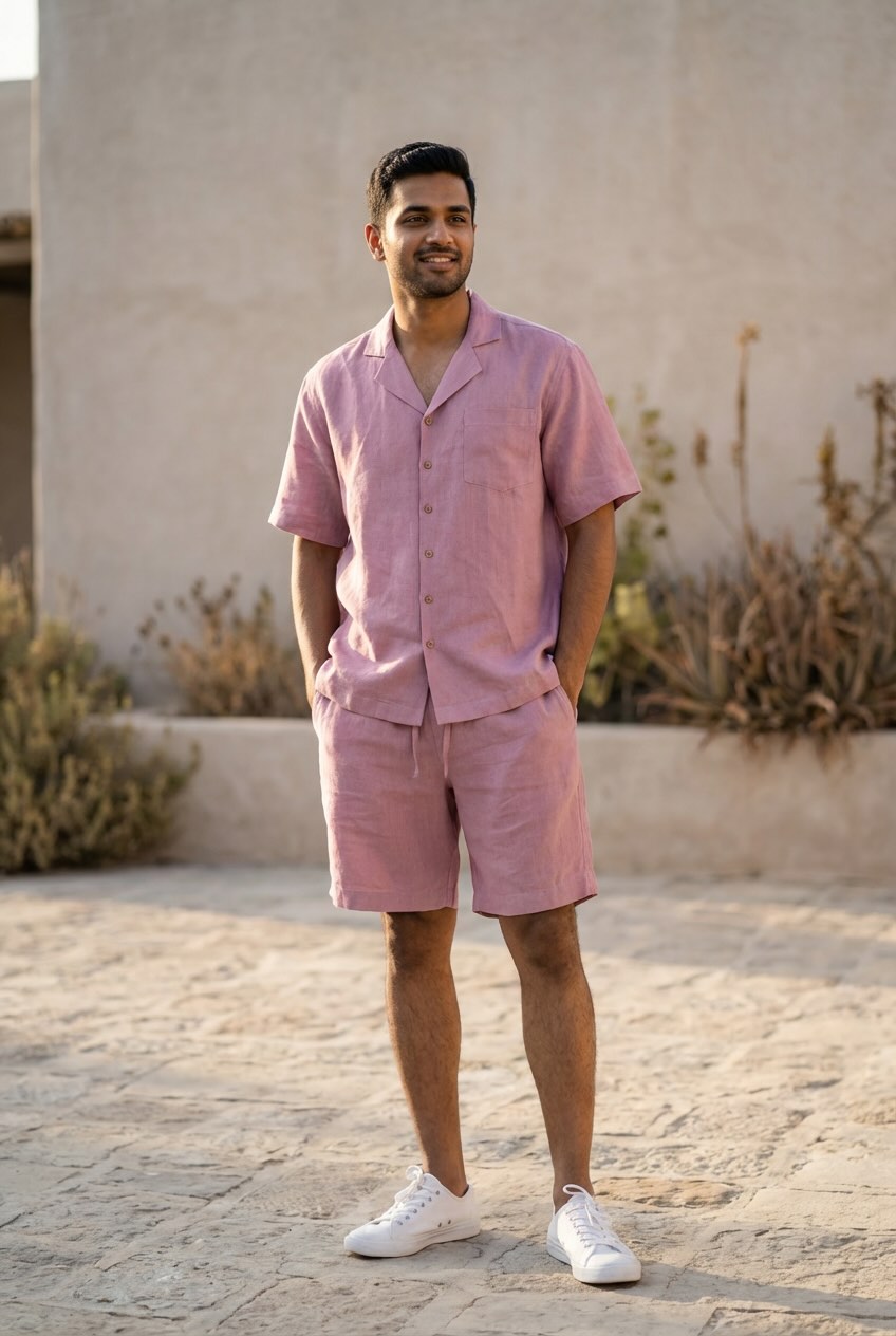 Resort collar Shirt and Shorts Co-ords - Men- 100% Premium Linen - Rose